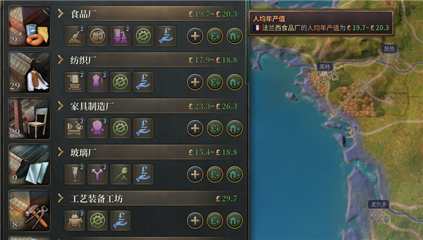 相同的建筑要集中,比如说同样是纺织厂,就要把他集中在一两个省份中,集中是为了吞吐量,建筑每提高一级就会增加一些吞吐量。随着科技的解锁,建筑获得的吞吐量也会越来越多。