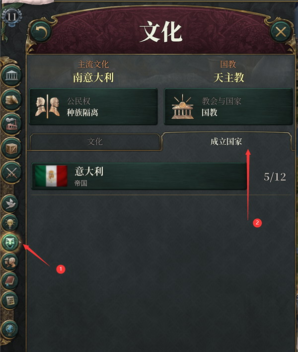 1、成立国家的选项在文化界面中。