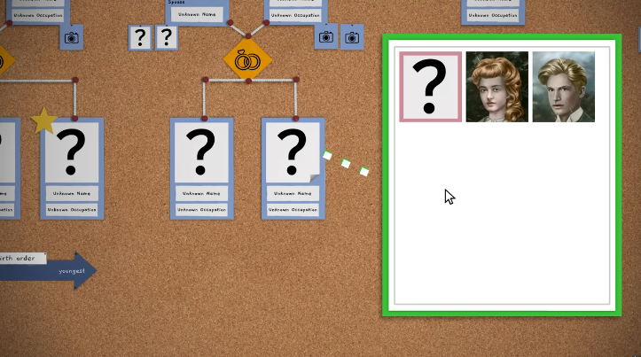 5、随后将已经确定人员的照片放入相对应的位置,玩家可以首先完成简单明确的角色,随后再借助已知推断位置,比如从第三代推断第二代和第四代。