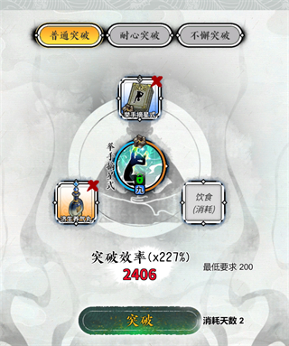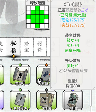 最后就是修炼武功时的突破了,在一个武学进行突破时,秘籍、丹药、饮食以及三种突破方式,都决定了最后的“突破效率”,只要文字变成了红色,那就是最好的突破效果了,堆叠更多的材料没有太大必要。