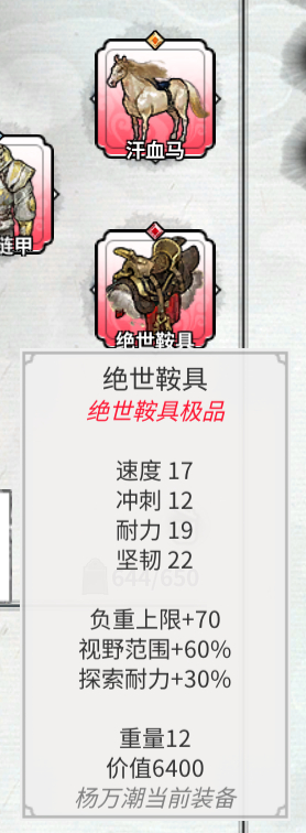 当然好马配好鞍,一个好鞍可以大幅度提高马的属性值以及负重、视野范围、探索耐力。