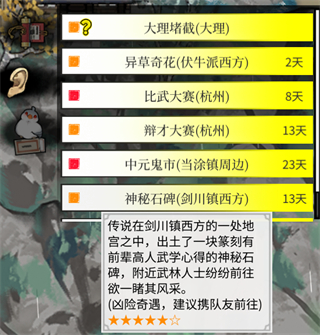 那就是右侧传闻的刷新,这些有着天数限制的传闻,会周期性的一直刷新,不要为此感到焦虑,该练功练功。去实际触发这些事件时,按照自己实际的战斗力(比如你一身蓝色稀有装备,就别去碰瓷紫色史诗事件了,大概率打不过)。