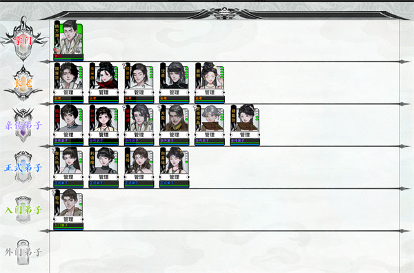 4、掌门:可以招募弟子,赏罚弟子,给门下弟子晋升,指导门派中其它弟子的行动方针。指挥弟子攻打其它门派。并且可以管理藏经阁中的武功,免费学习(不消耗功绩)任意武功,并且不用参与每月的例会。