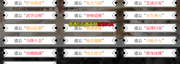 这里需要特别注意的是炉火纯青和绝艺超群这两个高频出现的可替换天赋,可以看到“返璞归真”或者“以劲御气”这样的高级天赋,都需要炉火纯青这个天赋作为前置,当你率先学习了类似于先天真气这样的天赋,替换了炉火纯青,那就代表其它以“炉火纯青”为前置的技能都无法学习了。