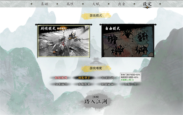 首先开局的难度选项,直接决定了我们人物能有几个天赋槽位,初露锋芒是9个,而最高难度的九死一生则是15个天赋上限。