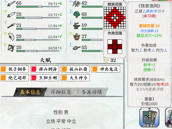 特别注意的一点,当你修练某一本秘籍时,他要求的修炼需求,是指需求你的基础属性。比如这本《铁索渔网》的修炼需求是射术25,而我的射术加成之后是25,但基础射术是24,在修练秘籍时,就不打标。会降低修炼时获取的经验。