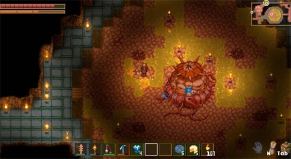 2、boss还会召唤虫群,生成在地面的红色缺口(图中人物上方就有一个),这个缺口占据3*3的地面,可以用虫巢墙壁包围,这样虫子就出不来了(虫巢墙壁可以用铁镐加两个石头戒指就可以挖掉了,也可以拿炸弹炸掉)。