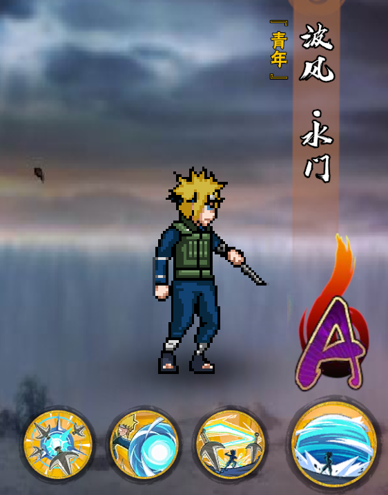 青年水门的普攻分为五A,1A苦无平推,2A飞身上挑击飞敌人,3A向地面丢出两枚飞雷神苦无,并标记对手,4A、5A瞬身至苦无位置追击。水门普攻丢出的苦无在场上最多,有4枚,当水门捡起地面苦无时,会散发黄色光芒进入特殊状态,并使下一次普攻变成转身横切。如果在转身期间受到攻击,水门会立即朝敌人丢出苦无,自身立即消失并出现在苦无位置,横斩攻击敌人。