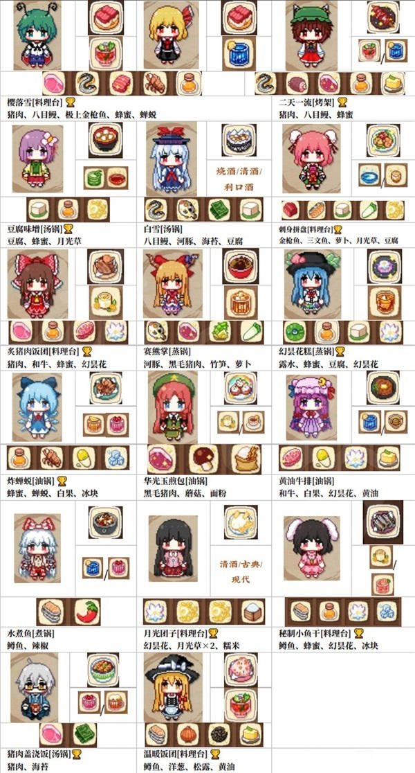 3、不同的顾客尽量选择不同的菜谱,以便在最后一关中高效制作和上菜(莉格露和露米娅的樱落雪可整合为同一份菜谱)。