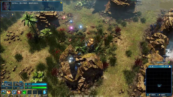 地图上方有一大片密集的丛林,十分影响视野;下方是碳矿和各种巨石分布,适合开局;各种水晶是明显分块分布的,如地图左方,就是一大片紫色的水晶
