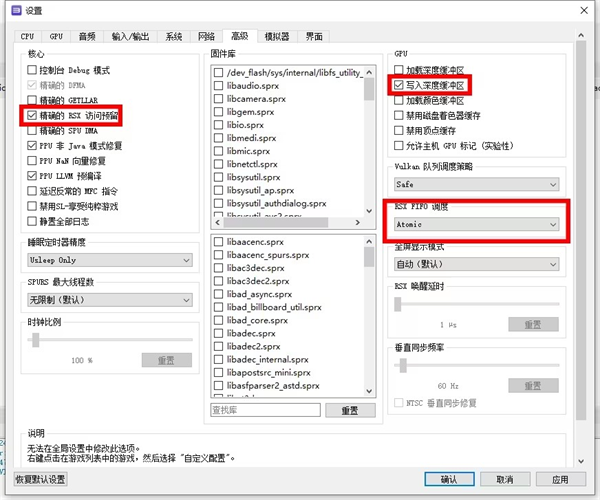 然后点击设置-高级设置,将“精确的RSX访问预留”,“写入深度缓冲区”勾选,将“RSX FIFO调度”改为“Atomic”,如图: