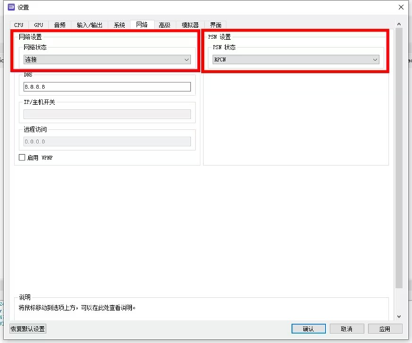 点击“网络”,将“网络状态”改为连接,将“PSN状态”改为RPCN。