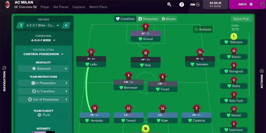 当《足球经理2022》切换到球场上的球员视角时,会提供多种不同的镜头视角,你还可以调整所看到的比赛画面范围。虽然观看比赛确实很有趣,但请记住,在模拟模式下,游戏时间会流逝得更快。根据您做出游戏决策的速度,适当调整游戏时钟的速度或许是个明智之举,这样能为您留出更多时间进行战术调整。