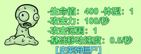 史莱姆僵尸对常规攻击有着极高的抗性,并且需要3次击杀才会彻底死亡,但是受到火焰伤害而死亡不会复活。攻击造成物理切割伤害。