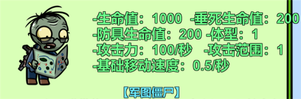 军图僵尸携带着一个脆弱的军图,报纸可以抵抗来自正面的伤害,其它方向的伤害和穿透伤害会攻击到军图僵尸军图本身,失去军图会让军图僵尸变得愤怒,愤怒时以600%的基础移动速度移动,并且射击。