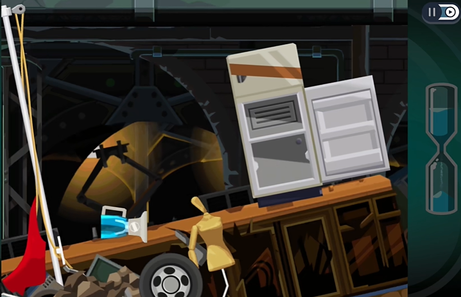 用假人拿到冰箱并打开冰箱,结果一个搅拌机掉了出来。再关上冰箱,然后打开搅拌机。去左边的风扇打开,然后迅速跳到旗帜处,趁风还没开始飘动。