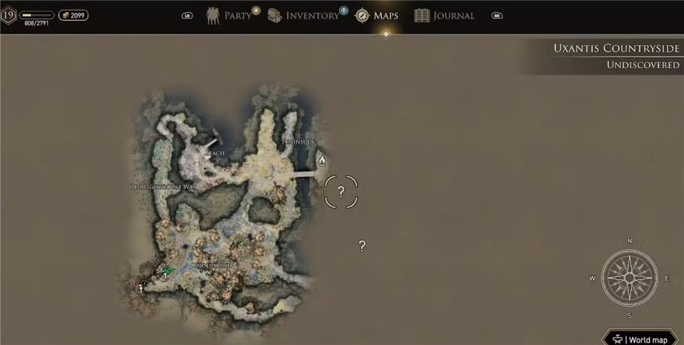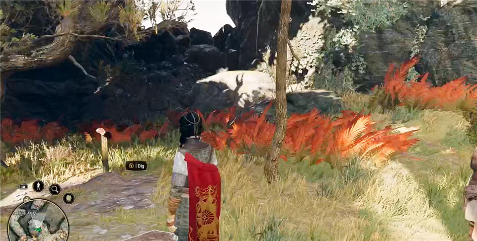 纸条上的谜语指向乌克桑蒂斯乡村一座绳桥对面的树桩。如果你打开地图,在绳桥对面篝火南侧标记问号,你会发现一个挖掘点。