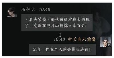 2、好感对话选择:石惊天会主动提起被贼徒掳掠百姓的事(眉头紧锁说:“那伙贼徒实在太猖狂了,竟敢在隐月山掳掠无辜百姓!”)。