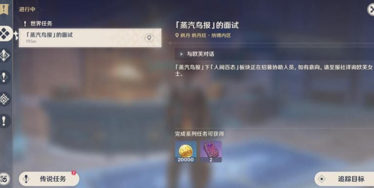 原神枫丹的声望任务需要完成任务蒸汽鸟报的面试解锁,这个任务会在旅行者冒险等级达到40级且完成了魔神任务第四章第二幕【仿若无因飘落的轻雨】后自动接取。根据任务指引去找报社主编欧芙和她对话,完成任务就可以解锁枫丹地区的声望任务了。