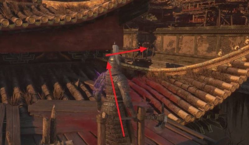 返回屋顶穿过木桥,经墙壁缺口直走至对面建筑楼梯处左拐。
