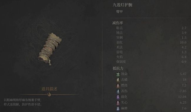 九莲灯护腕:以粗麻绳和厚麻布缠裹手臂,样式虽简陋,防护性却不错。