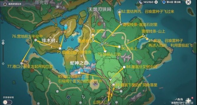 鸣神岛一共38个雷神瞳,有两个在雷结界内,需要雷樱树17级才能进入。