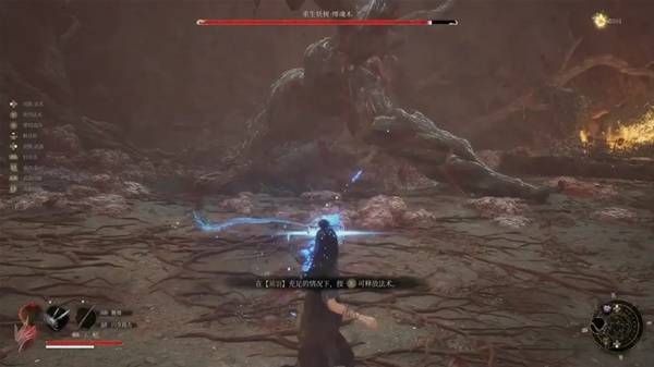 注意地上的蓝色小花,离近点会自动拾取转化为一根须羽,这里也提示玩家可以使用法术了。