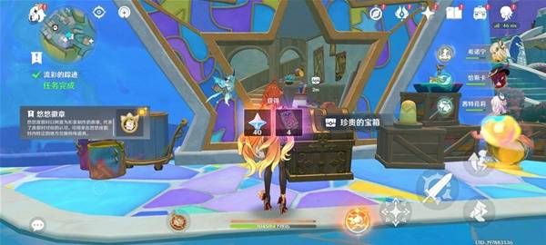 奖励合计:40原石,隐藏成就*1,珍贵宝箱*1,精致宝箱*2,角色及武器培养材料若干,解锁紫色调色板
