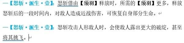 —【怒斩·派生·壹】:怒斩借由【须羽】释放时,所需的【须羽】更多,释放怒斩后的一段时间内,对敌人造成近战伤害,可恢复自身部分生命。