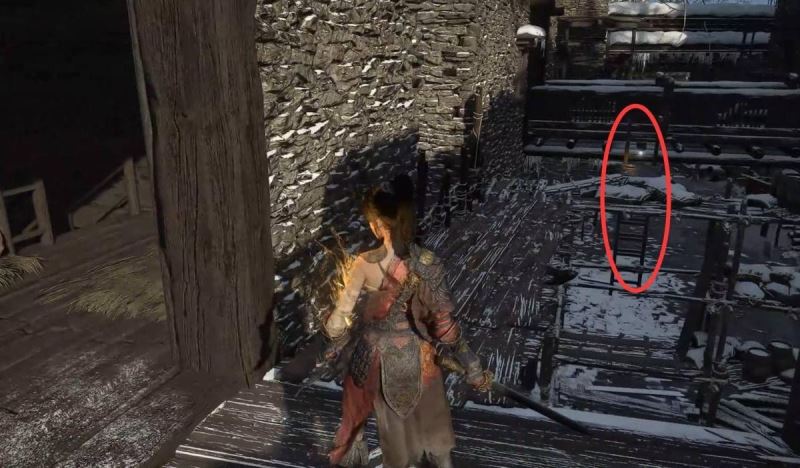 2、上梯子后前面的洞里有【烁光红羽】,捡完后穿过洞,上楼出去放下通往街道的梯子。右手边梯子上去可以和雪堡管家沈彦平对话,答应帮他找凤冠霞帔。