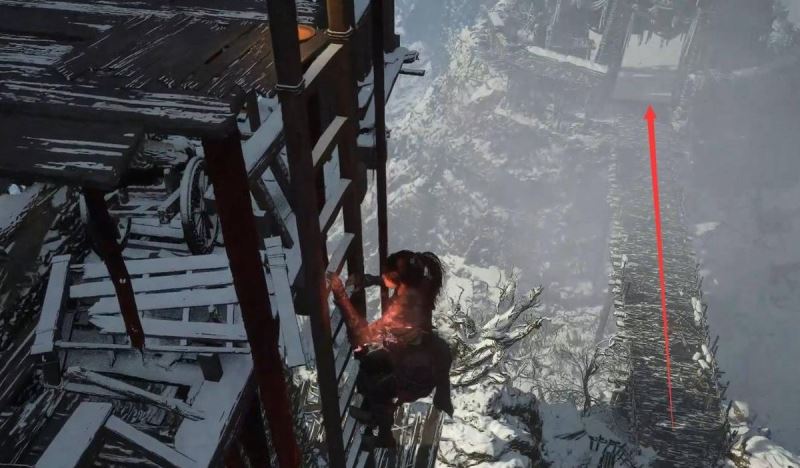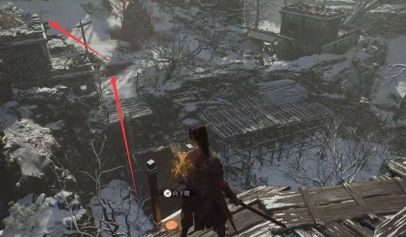 5、点燃烽火台后,塔顶可以放下一个梯子直接爬下烽火台。从刚才左边那条路,爬梯子上去,前往第二座烽火台。