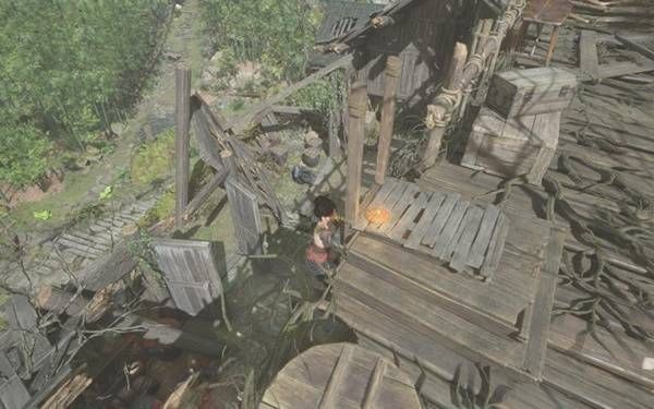 上梯子,过桥后上屋檐往左走,到下图的位置,可以打开一个门,然后往前。