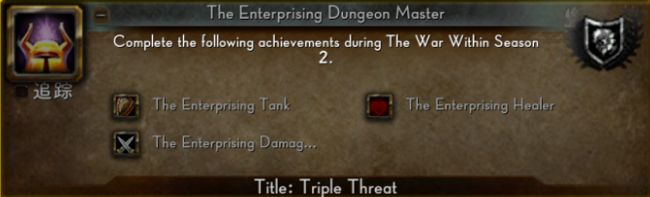 三重威胁是本次魔兽世界在更新中加入的一个全新成就,那么这个成就要怎么获得呢?我们需要使用坦克、治疗和输出的职责在时限内完成所有地心之战第二赛季的10级或更高难度的地下城,才能够获得这个成就。