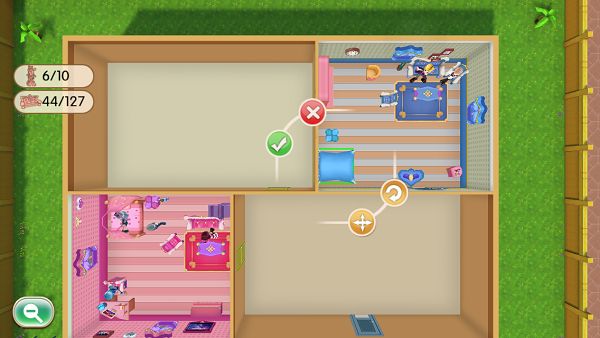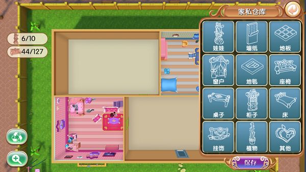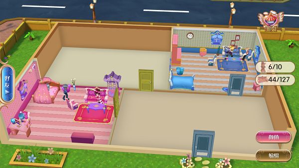 右上角返回主页,右中显示目前可放置的角色数量与家私数量,右下角有升级、颜值、编辑按钮,升级可扩大娃娃屋空间。