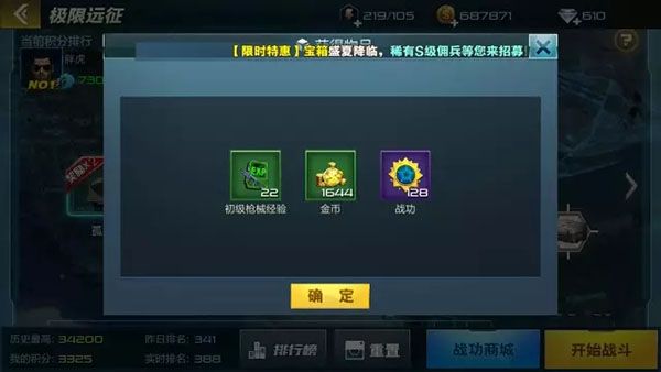 每关顺利通关后点击领取奖励会返回到极限远征关卡模式,当通关后,后面的宝箱就会自动开启,点击宝箱领取你所得到的奖励,大量的武器经验卡和特殊货币等着你来取走哟!