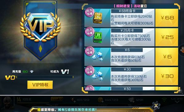 好了介下来,我们需要弄一些游戏中最重要的货币钻石,怎么样充钻石划算呢?这就是个学问了。首先当然是有充值活动的时候充划算,这个应该地球人都知道。然后就是我们需要有每天固定的钻石来源。抢滩登陆3D很贴心的有两种优惠卡可以获得钻石,一种是25元的月卡,购买月卡可以立即获得750钻石,并且连续30天每天可以领取300钻石;另外一种是68元的终身卡,购买终身卡可立即获得2040钻石,游戏运营期间每天可领取300钻石。