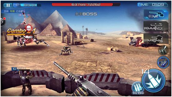 首先进入1-3关卡后会有2波小怪出现,只需要无脑突突即可。2波小怪过后BOSS立刻就会想你跑过来,不时的像你射击,玩家也只需要不停打击BOSS就行,当玩家出现图中情况一定要连续射击BOSS弱点,这样BOSS受到的伤害会更大,最后轻松过关。