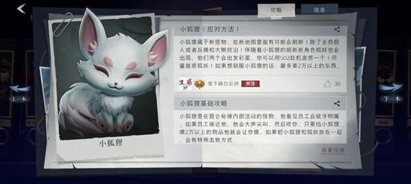 基础信息:只在昆仑雪山出现,抚摸会攻击,投喂后不咬人并带你找金,被击杀后召唤狐妖不死不休,与狐妖相遇会有动画,投喂完抱狐狸时遇到狐妖攻击触发双方消失
