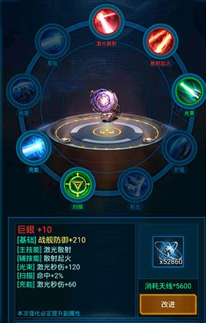 1、雷达商城亲密度LV.10可刷新出的巨眼,主技能激光散射,副技能散射起火,主属性从激光秒伤、激光制空防御中随机,散射起火的效果是在触发激光散射之后,被散射的战舰100%会“起火”。