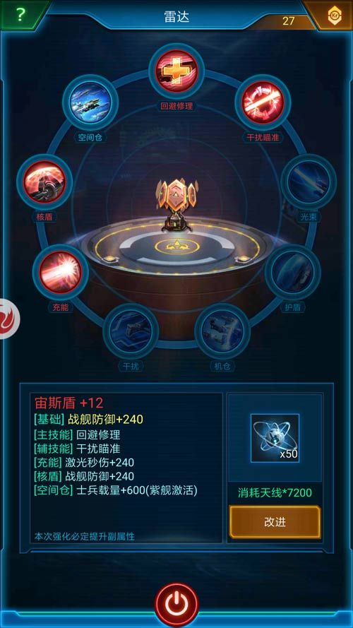 想拥有足够出色的雷达,还需要在银河战舰雷达站消耗天线改进,每次改进都能提升雷达基础属性,同时有概率解锁新技能。