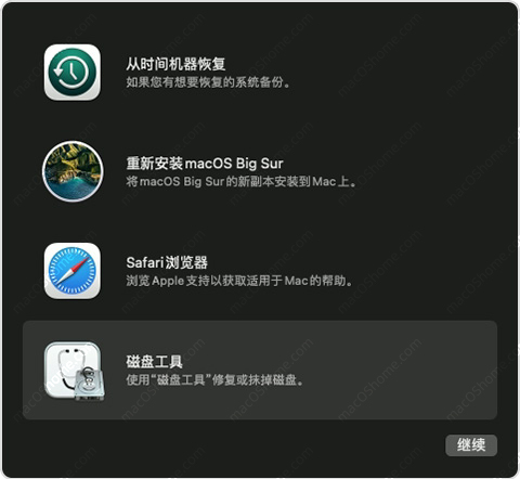 从实用工具窗口中,选择“磁盘工具”,然后点按“继续”。
