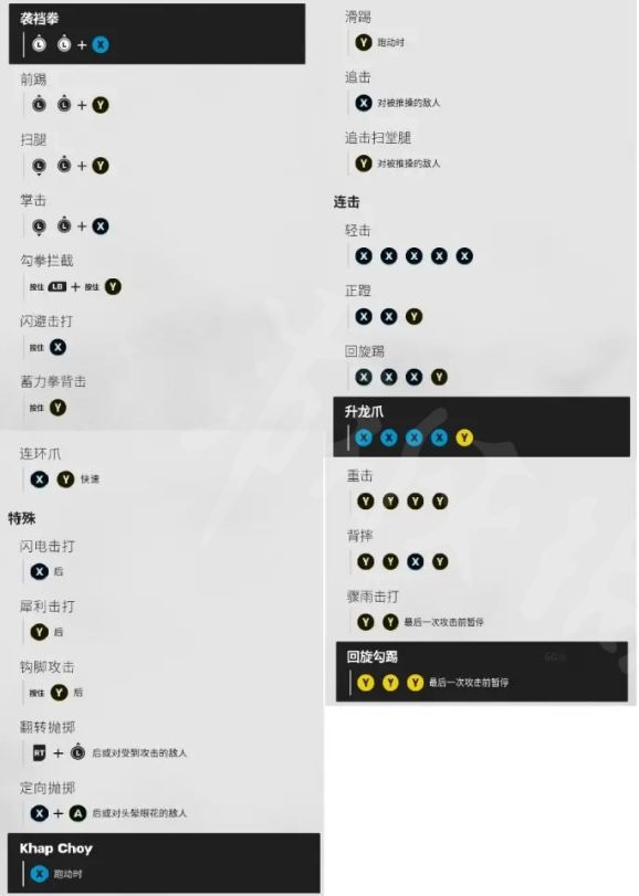2、【Y键】——Y、长按Y(蓄力拳背击)、下上Y(扫腿)、上上Y(前踢)、格挡后Y(犀利打击)、奔跑时Y(滑踢)、对被推搡敌人Y(追击扫堂腿)