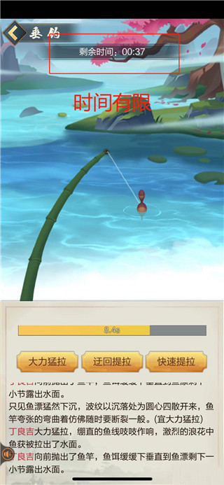 在鱼塘中钓鱼是会给玩家时间限制的,玩家在规定时间内能钓上来的鱼是在玩家的速度的,每一竿的时限是十秒钟,在鱼塘内能够待六十秒,但一般来说鱼竿进入鱼塘大约五六秒就会有反应,所以考验玩家的反应速度,玩家一定要盯着文字信息,快速选取正确的钓鱼方法,这样能够最短的时间钓上鱼来,这样六十秒有更多的下竿机会,钓上鱼的机会也就大大增加了。
