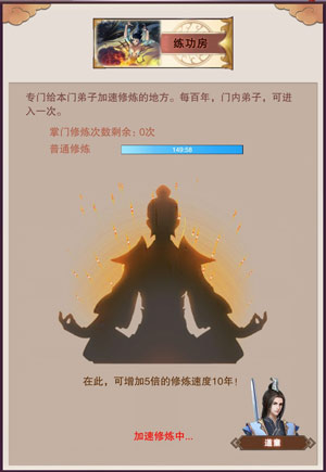 练功房每个门派都有,在练功房练功可以增加修为速度,修炼一次需要1000灵石,五倍速度修炼十年,每天必进。