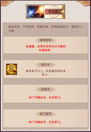 传功房,门派的绝学(加修为)和技能(炼丹/炼器术)可以在这里学到,进门派第一件事进传功房看,有无绝学和有无技能。