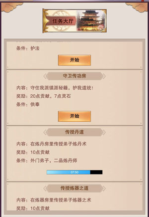 任务大厅,做任务获取宗门贡献,贡献是门派的货币,可以在门派内【兑换商品】【领门派奖励】【提升级别】。贡献的获得方法做任务,进入门派--任务大厅--选择一个符合条件的任务开始做,贡献就会随时间自动增加了。