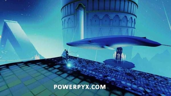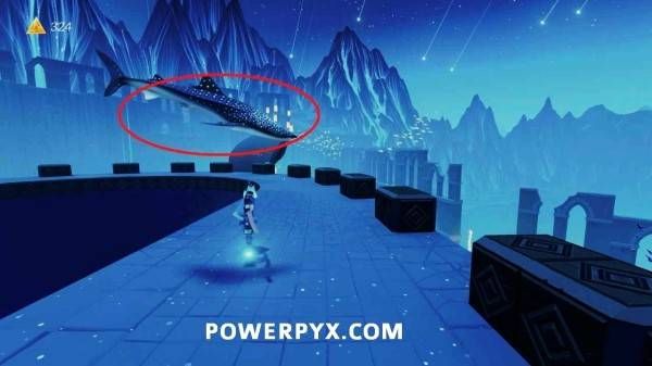激活巨大雕像手上的水源点使海水归位后,区域中会出现许多鱼群,其中包含多只座头鲸,利用场景中新生成的海草跳到座头鲸背部。
