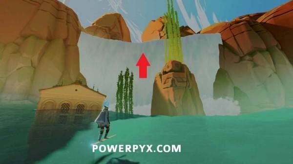 激活右侧链条的出水点,绕道建筑后方将海水归位,沿着海草往上爬到瀑布顶端,继续沿路往前走即可到达石板所在平台。