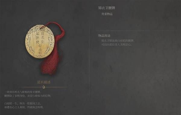 记得去调查遗书,获得贵重物品【锦衣卫腰牌】,这个道具可以表明持有者的身份“白庭昭”,也就是无常的父亲。描述有说“遭有心之人利用”,明显指向了某个道士。