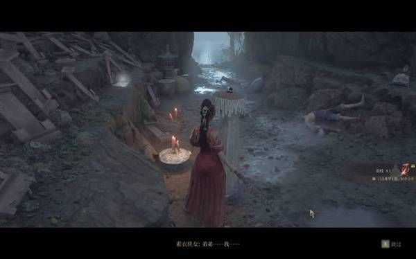 (2)从白家旧宅神龛出发,往前继续走,进山洞,见到素衣侠女站在白家祠堂前,对话获得羽枝1个。